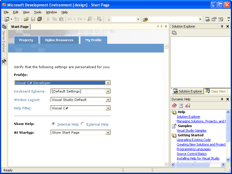 The Visual Studio .NET IDE will start. The Start Page is displayed by default whenever you start Visual Studio .NET, and provides links and tools to help you configure the IDE, open recent projects, create new projects, and many other tasks. By default, the IDE will display the Projects tab of the Visual Studio .NET Start Page. This tab allows you to quickly open a recent project or to create a new project. The Online Resources tab allows you to find sample code, access online community resources, find .NET downloads, and more. You’ll see more of this tab in a bit. The My Profile tab of the Start Page, shown in the following illustration, allows you to configure the layout of the tool windows in Visual Studio .NET, as well as the keyboard shortcuts used to accomplish common tasks.