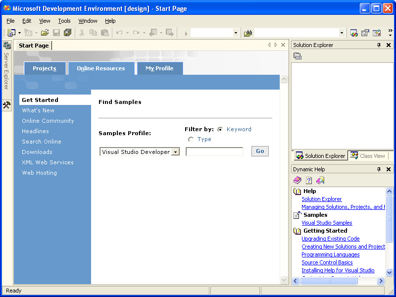 By default, the Get Started section will be selected (if it’s not, click Get Started). Here you can search for samples based on the developer profile (Visual Studio, Visual Basic, Visual C++, or Visual C#) and filtered by keyword or type, as shown in the following illustration.