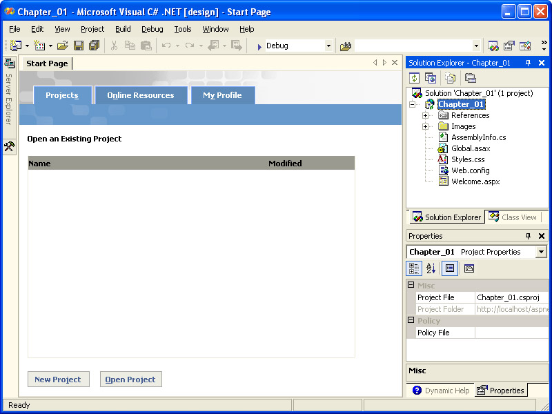 2. Browse to the location where you installed the practice files (the default is C:\MS Press Books\ASPNETSBS_CS), open the Chapter_01 folder, select the Chapter_01.csproj file, and then click Open. (Alternatively, you can open all the projects installed with the practice files by selecting the aspnetsbs.sln file located in the aspnetsbs_cs folder.)