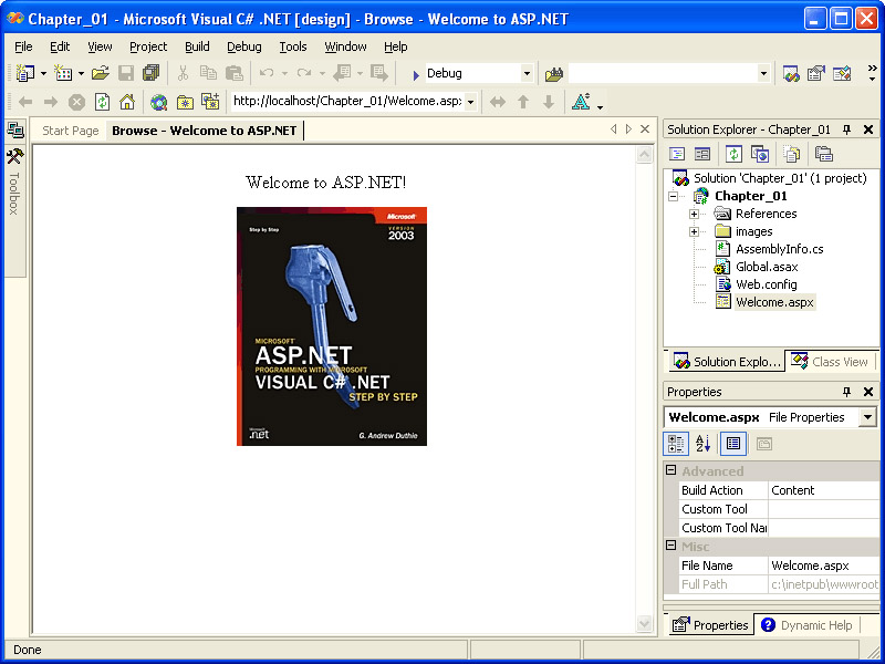 The Welcome.aspx page, shown in the following illustration, will be loaded into a browser window that is integrated into the IDE. You can browse pages in a Microsoft Internet Explorer external browser window or with browsers other than Internet Explorer by right- clicking a page, selecting Browse With, and then choosing your desired browser and other options.