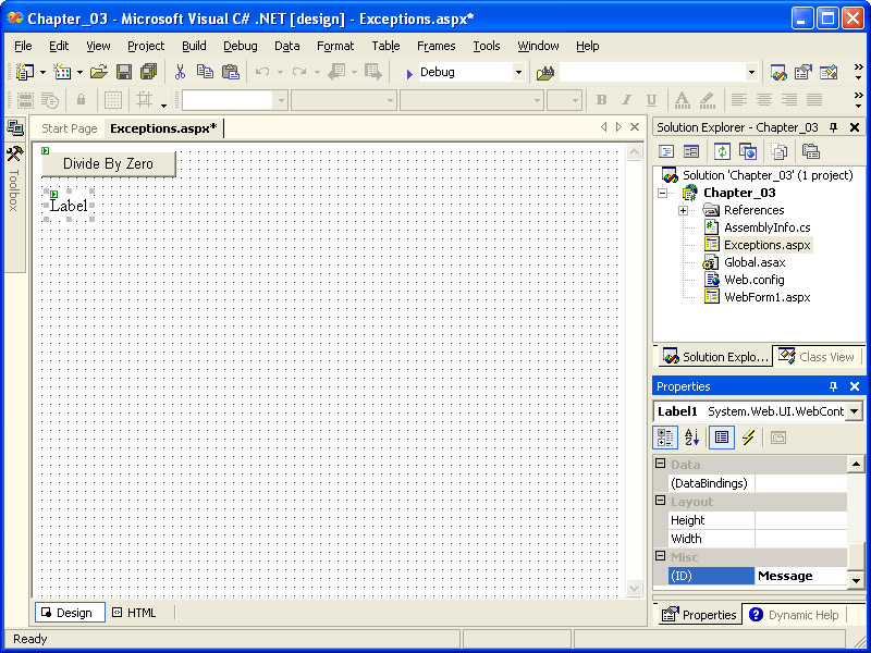 What happens if an exception is thrown and your code does not catch it? Probably not what you would like. This next example will step you though the process of creating a page that generates an unhandled exception, and then adding exception handling to properly handle the exception.