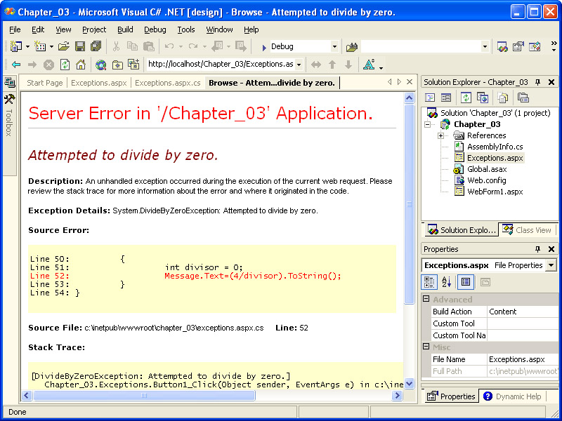 Browse the page by right-clicking it in Solution Explorer, and then selecting View In Browser (or Browse With). When you see the screen with the Divide By Zero button, click the button. You will see a screen similar to the following illustration, in which the Output window is closed to allow you to see more of the error page.