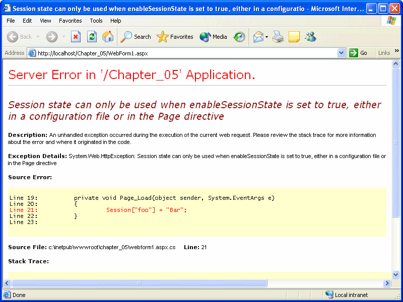 The request will result in an exception, because you’ve removed the SessionStateModule from the application. Had you not modified the <customErrors> element in Step 3, you would see a generic error message instead of the detailed message shown on the next page.