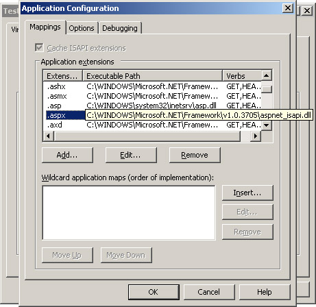 To verify that the configuration was successful, open the IIS Manager, navigate to the application in question, right-click the application and select Properties, and then click the Configuration button. In the Mappings tab, scroll down to the .aspx extension, and hover the mouse over the Executable Path column for that extension. The version number in the tooltip that displays the path to the executable should look like the one in the following illustration (from the Windows Server 2003 version of the IIS Manager).