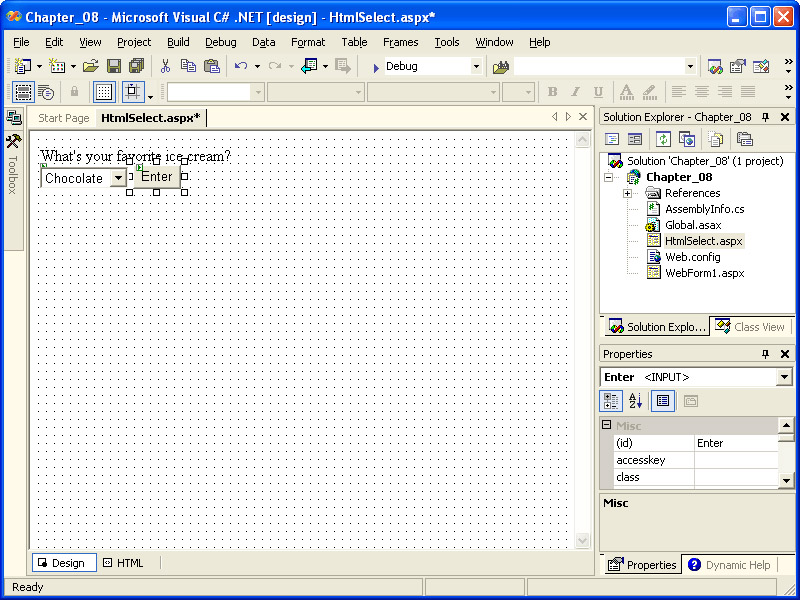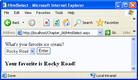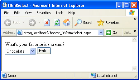 Using the tabs at the top of the editor window, switch back to HtmlSelect.aspx. Double-click the button. This will add the Enter_ServerClick event handler to the code-behind module, and switch you back to the code-behind module. Add the following code to the Enter_ServerClick event handler: