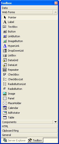 The Web controls run the gamut of functionality, from simple controls such as the Button, TextBox, and Label controls, to the richer ListBox and DropDownList controls, to the even richer Calendar and AdRotator controls. There are even controls especially designed for data binding, including the DataGrid, DataList, and Repeater controls. You’ll see examples of these controls in later sections.