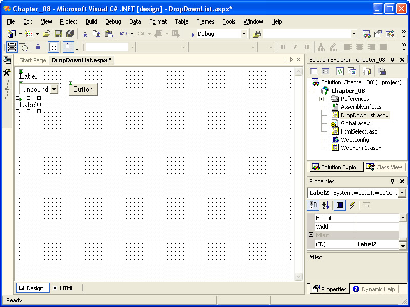 Open the Chapter_08 project created earlier in this chapter if it is not already open. Add a new Web Form to the project and type its name as Calendar.aspx.