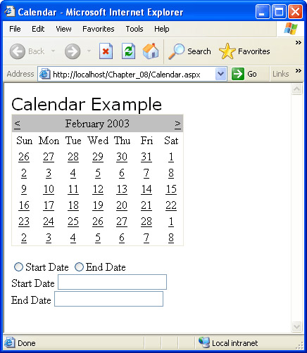 <asp:label id="title" text="Calendar Example"  font-name="Verdana" font-size="18" runat="server"/> <br/> <asp:calendar id="Calendar1" runat="server"/> <br/> <asp:radiobutton id="StartRadio" text="Start Date groupname="Chooser" runat="server"/> <asp:radiobutton id="EndRadio" text="End Date groupname="Chooser" runat="server"/> <br/> <asp:label id="StartDateLabel" text="Start Date" runat="server"/> <asp:textbox id="StartDate" runat="server"/> <br/> <asp:label id="EndDateLabel" text="End Date" runat="server"/> <asp:textbox id="EndDate" runat="server"/>