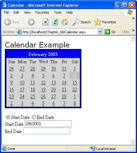 Save the page and code-behind module, and then build the project and browse Calendar.aspx. At this point, you should be able to use the calendar to set the value of both text boxes. Which text box is set depends on which radio button is checked.