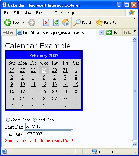 Another one of the previous examples with the potential for trouble is the Calendar control example. As coded in the example, the Calendar control can be used to set a start date that is later than the end date. Clearly, if you’re storing these dates or using them to drive some programmatic logic, this is not something you want to allow. Fortunately, the CompareValidator control can help prevent this problem, as illustrated by the following example.