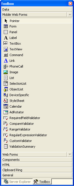 The Mobile Web Forms control toolbox pane, shown in the following illustration, contains the controls you’ll want to use in your ASP.NET mobile Web application development. The toolbox contains familiar controls, such as the Panel, Label, and TextBox controls, as well as some new ones that we’ll discuss next. In addition to the new controls, some of the existing controls have added functionality specific to mobile development, such as the ability to have more than one form per mobile Web Form page, and the ability to render differently depending on the device accessing the application.