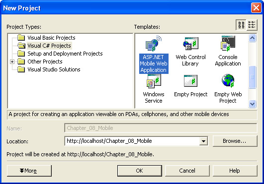 Create a new project in Visual Studio .NET, using the ASP.NET Mobile Web Application template, as shown in the following illustration. Type the name of the project as Chapter_08_Mobile.