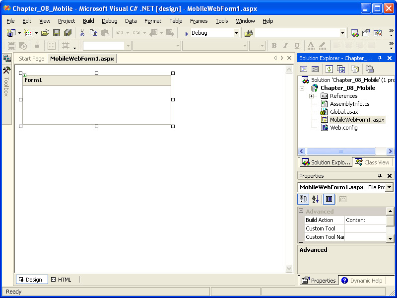 When the project is created, the default page, MobileWebForm1.aspx, will be opened in the Visual Studio editor. The page will contain one Form control, as shown in the illustration on the following page.