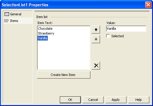 Select the SelectList control, then scroll down in the Properties window to find its Items property and highlight it. Click the ellipsis button to open the Properties dialog box for the control. Using the Create New Item button, create three items, and set the text and value of each by typing Chocolate, Strawberry, and Vanilla, respectively. When finished, the dialog box should look like the following illustration. Click OK to close the dialog box.