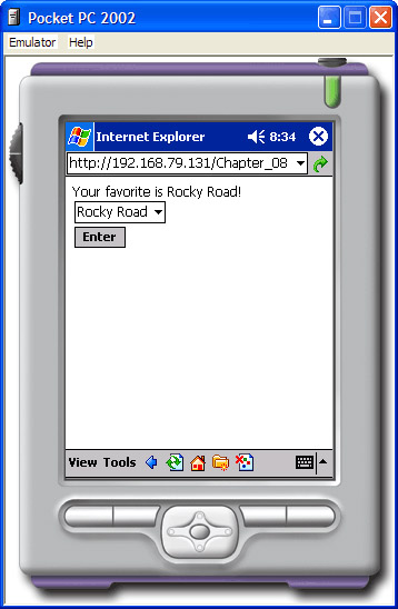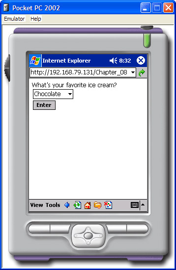 You can test your work using the standard built-in browser, but that’s not terribly useful in telling you how it will look on a cell phone or PDA. A better bet is to use either the actual device you’re developing for, or an emulator for that device. Emulators are often available from the manufacturer of the device you’re developing for. The following illustration shows the initial output of the previous example on the PocketPC 2002 Emulator.