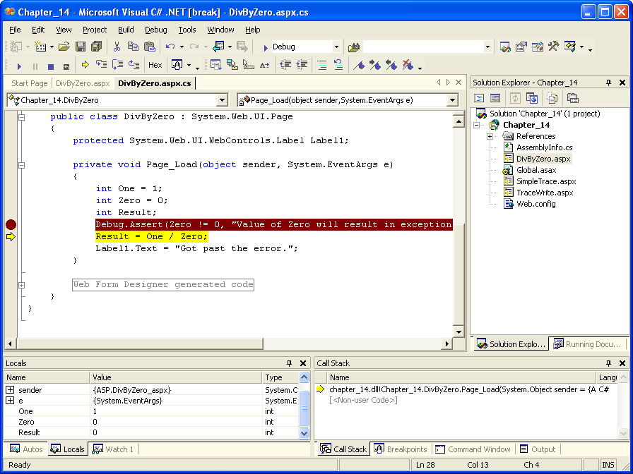While it’s obvious what the problem is in this example, suppose you needed to determine exactly why the divide by zero exception was happening. One way to find out is to step through the code and check the values of your variables as each line executes. Start by scrolling down to the Page_Load event handler. Along the left side of the code window is a gray bar. Click on the gray bar to the left of the line with the Debug.Assert. A red dot indicating a breakpoint will appear on the gray bar, and the line will be highlighted. The following illustration shows the breakpoint set in Visual Studio .NET.
