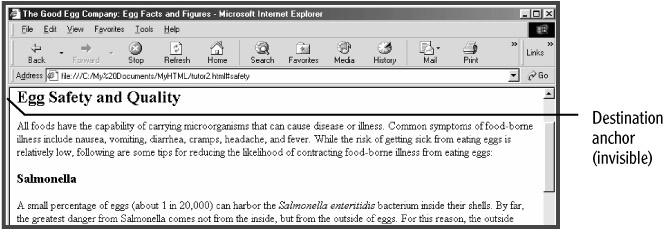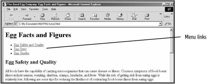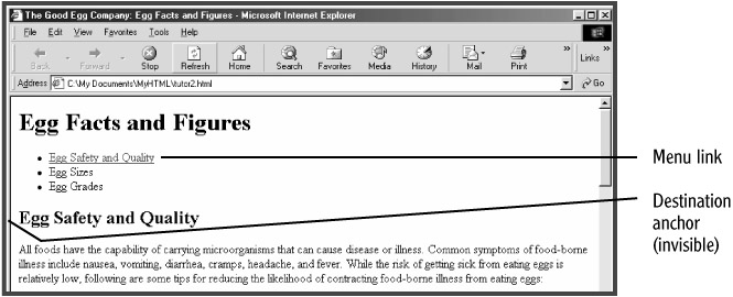 Test the menu link you just created. Be sure to save your document in your text editor (File, Save) and refresh the display of your page in your browser (click the Restore or Reload button, or press Ctrl+R). Click on the first list item, which has been turned into a link. Your browser should display the level-two heading ("Egg Safety and Quality"), which you marked previously with the "safety" destination anchor, at the top of the browser window (see Figure 3.3).