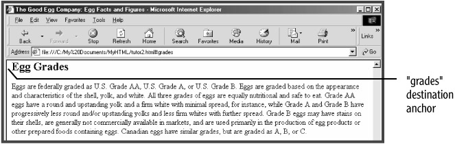 Save your document in your text editor and refresh it in your browser (click the Refresh, or Reload, button). If you now click on the third menu link ("Egg Grades"), it should jump to the heading you marked with the "grades" destination anchor (see Figure 3.5).