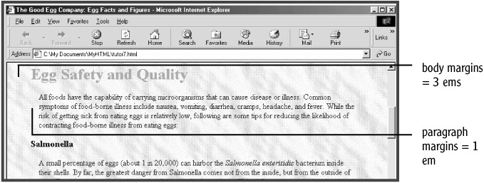 Using styles, you can set margins for any element. For example, use the margin property to set a three-em margin around the document body and use the margin-left and margin-right properties to set one-em left and right margins for the paragraph element (see Figure 8.13):