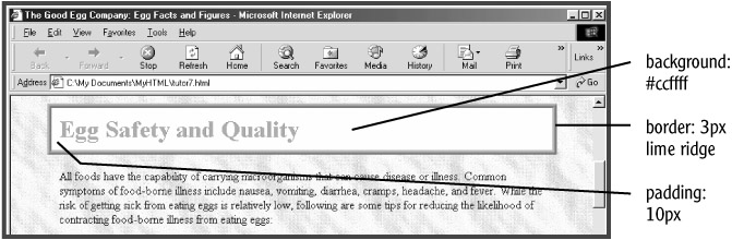 While margins add space outside of an element, padding adds space inside of an element, between the element content and its border. To see this for yourself, for the H2 element, set a light-blue background color and then use the padding property to set 10 pixels of padding around the element's content and the border property to set a lime-colored, 3-pixel, ridged border around the element (see Figure 8.14):
