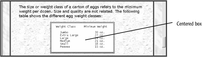 You can also use the DIV element to create a centered box. To try this out, first bracket the PRE element (in the "Egg Sizes" section) with a DIV element with a class="centerbox" attribute and delete the leading spaces inside the PRE element: