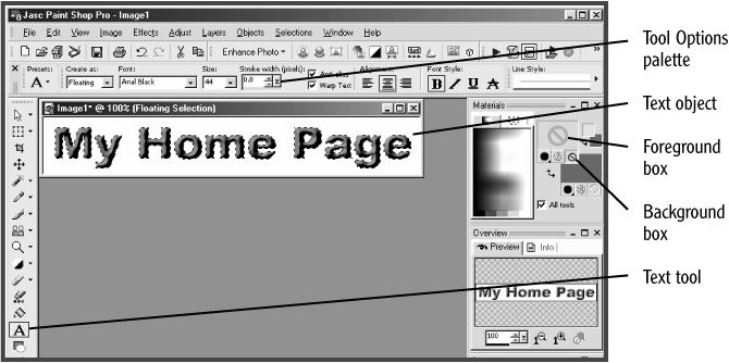 The easiest way to overcome this problem is to turn off anti-aliasing (uncheck the Anti-alias check box on the Tool Options palette in Paint Shop Pro 8) when creating text in an image that you want to display transparently against a Web page's dark background. The example file, myhome_dark.html, shows this; just open it in your browser to take a look (see Figure C.6).
