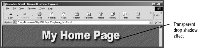 To see your transparent GIF image in action, you need to insert it in a Web page with a background color or image set. An example Web page has already been created for you that shows a transparent GIF image displayed against a background image. In your browser, just open myhome_trans.html from the AppC folder (see Figure C.4).