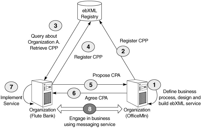 Flute Bank wants to engage in business with OfficeMin. It queries the ebXML registry-repository and retrieves OfficeMin's Collaboration-Protocol Profile.