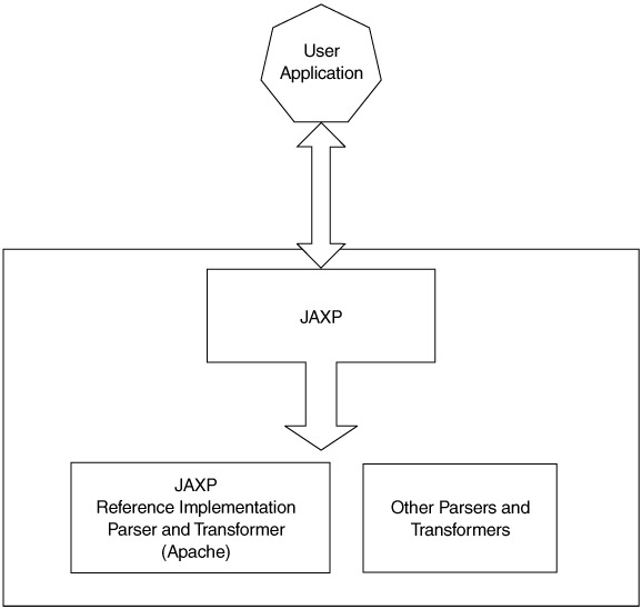 As Figure 9.1b shows, the abstraction in JAXP is achived from its pluggable architecture, based on the Factory pattern. JAXP defines a set of factories that return the appropriate parser or transformer. Multiple providers can be plugged under the JAXP API as long as the providers are JAXP compliant, meaning that they implement the specifications through the interfaces.