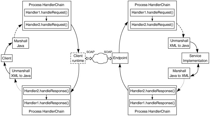 The handler is passed an instance of a MessageContext, which can be used to access the underlying Soap with Attachments API for Java (SAAJ) javax.xml.soap.SOAPMessage that represents the actual message. It can also be used to pass objects between handlers in the chain, to share state information specific to a request. Note that a handler is always stateless itself and should not hold any message-specific state in an instance variable. The lifecycle of a handler instance is quite similar to that of a servlet: