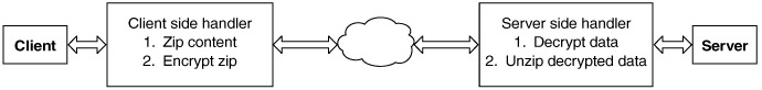 The order in which handlers are deployed is important. For example, if a client sends an encrypted request in a compressed format, the handlers on the server must first decompress and then decrypt the input. Like individual handlers, chains can be defined on the client, the server, or both. The steps below describe how execution occurs in a chain (see Figure 10.7):