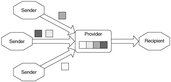 Point-to-point. In this model, the sender sends the message, which is put on a queue, and a single consumer reads the message off the queue. There is exactly one recipient (Figure 11.8a).