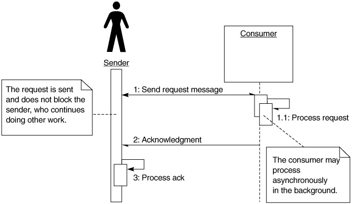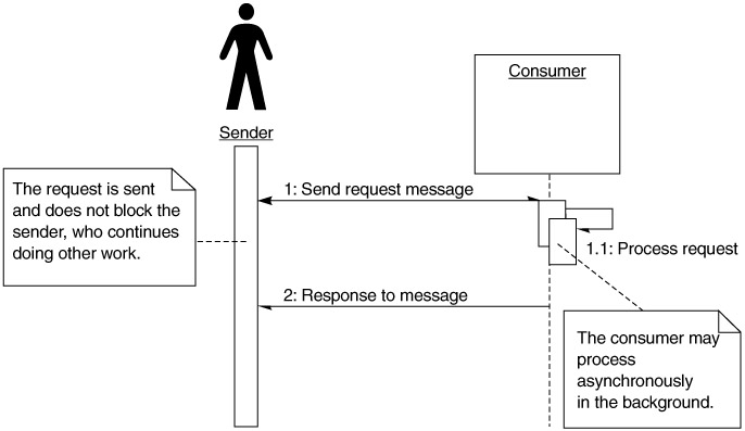 One-way messaging. The client sends a message and does not block or wait to receive a reply (Figure 11.27). It is free to do other work. This is analogous to sending a fax (fire and forget!) A number is dialed and a fax sent. You do not need a person to answer the other phone (just a fax machine). This also implements use cases corresponding to an asynchronous-update pattern, in which data on the receiver's side is updated with new values.