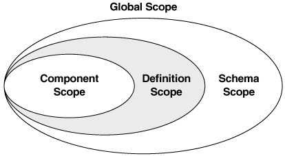 A binding declaration has scope that specifies the schema elements to which it applies. There are four levels of scope, described below and shown in Figure 13.3, ranging from the generic to the specific. The more specific scope (e.g., component) overrides the higher-level (e.g., global) scope.