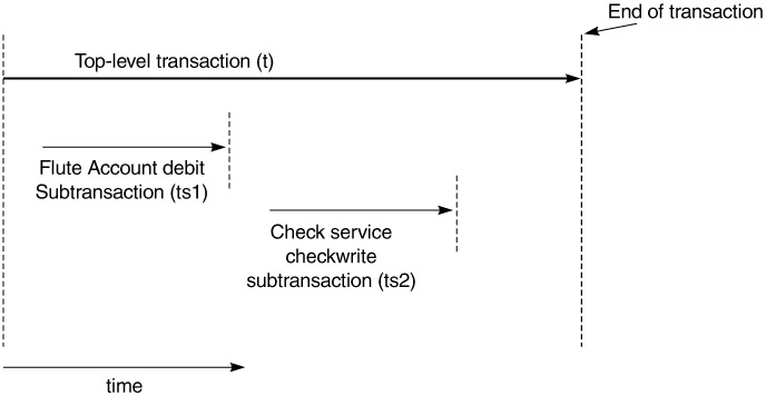 A nested transaction model, shown in Figure 14.2, is one solution to the above problem. It allows transactions to consist of other transactions: a top-level transaction may contain subtransactions. In a nested transaction model, with respect to the above example, the bill payment service would start a top-level transaction (t). Both the account management service and the check writing service are free to start new transactions (ts1 and ts2). But both these subtransactions are within the scope of the top-level transaction (t). Transactions in a nested transaction model also adhere to the ACID properties of transactions-that is, t completes successfully only if ts1 and ts2 both complete successfully. If either subtransaction fails, the top-level transaction would fail, thereby guaranteeing atomicity.