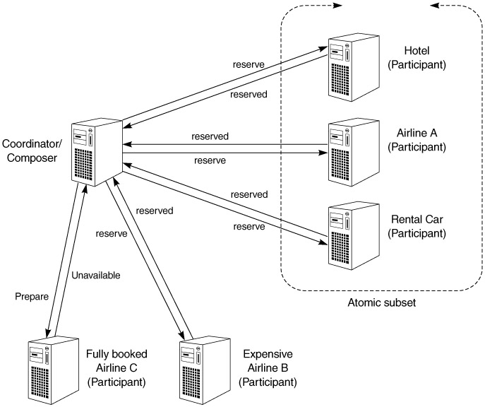 Airline C's failure to commit seats cannot be considered a failure of the reservation transaction as a whole, because the application can determine the atomic subset of participants, based on business logic. As a result, the atomic property of the transaction need not be satisfied. Moreover, should multiple airlines lock seats (Airlines A and B), a compensating transaction that releases previously booked seats will have to be generated for Airline B, so that only one airline eventually reserves the required seats. This, in effect, conceptually relaxes the durability property of the reservation transaction initiated by the travel service. For this solution to work, application logic has to be written to select the subset of activities that must be considered atomic and also to generate compensation transactions.