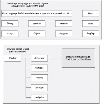 Up until this point we have focused on primarily the first and second aspects of JavaScript. This part of the language is actual fairly consistent between browser types and versions, and corresponds to the features defined by the ECMAScript specification (http://www.ecma-international.org/publications/standards/Ecma-262.htm). However, the actual objects with which we can manipulate the browser and document do vary. In fact, in Figure 9-1 you’ll notice that it appears that the Browser Object Model (BOM) and Document Object Model (DOM) are somewhat intermixed. In previous versions of the browser there really wasn’t much of a distinction between the Browser Object Model and the Document Object Model—it was just one big mess.