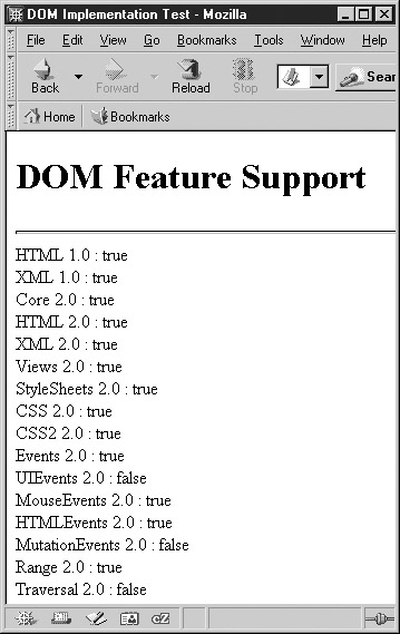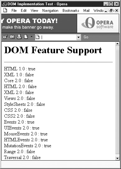 According to the DOM specification, we should be able to test for the availability of a particular aspect of the DOM specification using document.implementation.hasFeature() and pass it a string for the feature in question like “CORE” and a string for the version number—at this point “1.0” or “2.0.” The following script shows how you might detect the DOM support in a browser.