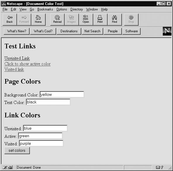 The traditional JavaScript object model supports numerous properties to read and set the color of the document and its text and links. The Document properties for accessing page color are shown in Table 13-1. Notice how these properties correspond to the HTML attributes for the <<body>> tag.