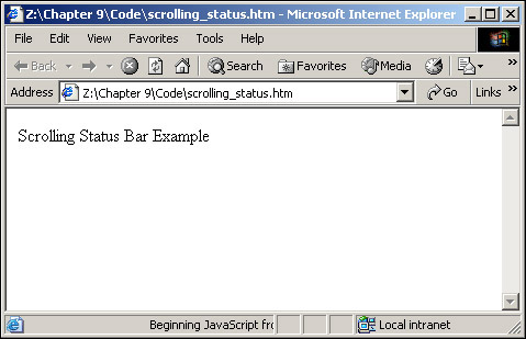 Save the page as scrolling_status.htm and load it into your browser. In the status bar at the bottom of the browser's window, you'll see this scrolling message: Beginning JavaScript from Wrox Press.