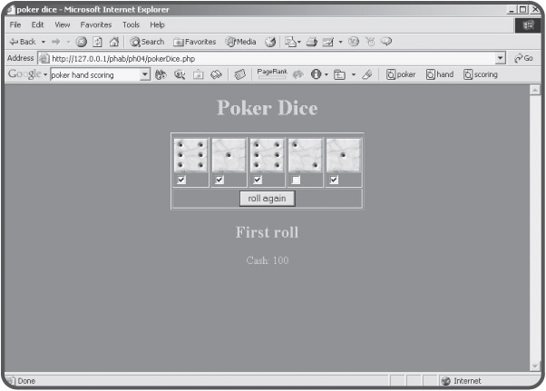 The main program for this chapter is a simplified dice game. In this game, you are given $100 dollars of virtual money. On each turn, you bet two dollars. The computer will roll five dice. You can elect to keep each die or roll it again. On the second roll, the computer checks for various combinations. You can earn money back for rolling pairs, triples, four and five of a kind, and straights (five numbers in a row) Figures 4.1 and 4.2 illustrate the game in action.