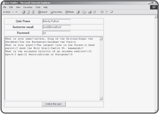 Users with knowledge of the appropriate password can take any of the quizzes known to the system. If a user chooses to take the Monty Python quiz, the screen shown in Figure 6.3 appears.