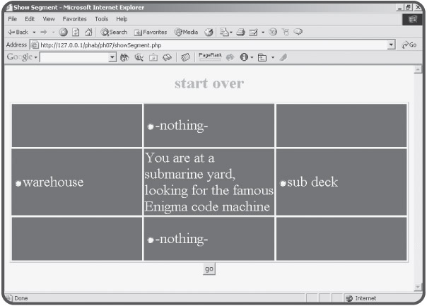 This program is interesting as a game, but the really exciting part is how the user can modify this game. A user can use the same system to create and modify adventures. Figure 7.3 shows the data behind the enigma game. Note that you can edit any node of the game by clicking on the appropriate button from this screen.
