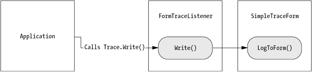 The solution used in this example creates a generic listener that forwards trace messages to a form, which then handles them appropriately. This arrangement is diagrammed in Figure 4-2.