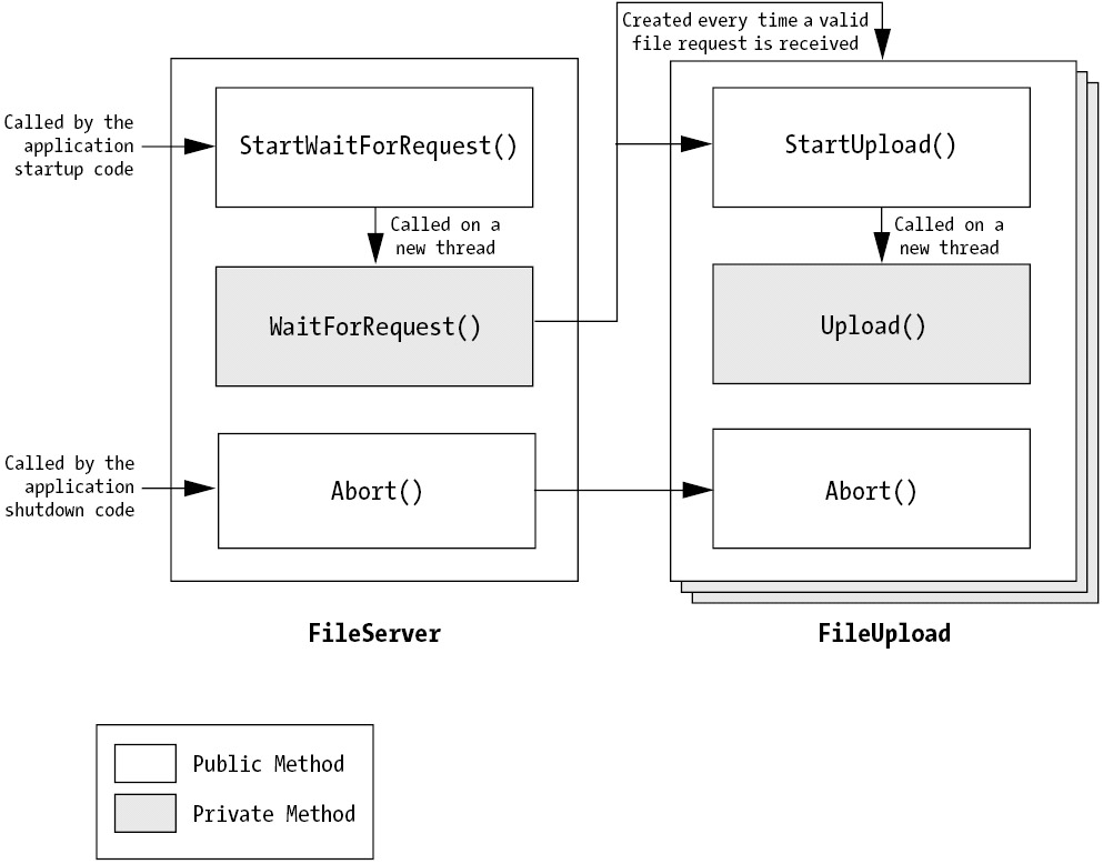 The WaitForRequest() method contains some more interesting code. First, it instantiates a TcpListener object and invokes the AcceptTcpClient() method, blocking the thread until it receives a connection request. Once a connection request is received, the code creates a new FileUpload object, starts it, and adds the FileUpload object to the UploadThreads collection.