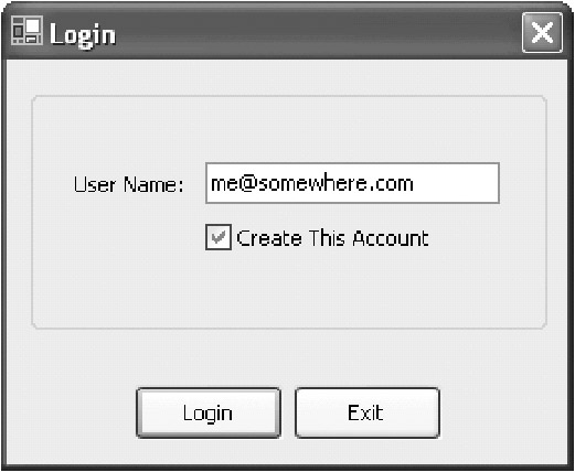 Finally, the Login window is modified to include a check box that the user can select to create the account for the first time, as shown in Figure 10-2.