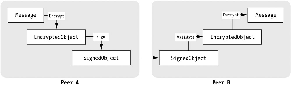 When sending a message, you need to construct a Message object and encrypt it. You don't need to use the Serialize() method to convert it to a byte stream because the .NET Remoting infrastructure can automatically convert serializable types for you. The full code is shown here, with the modified lines highlighted in bold. Note that the public XML information is retrieved from the web service as needed for the peer.