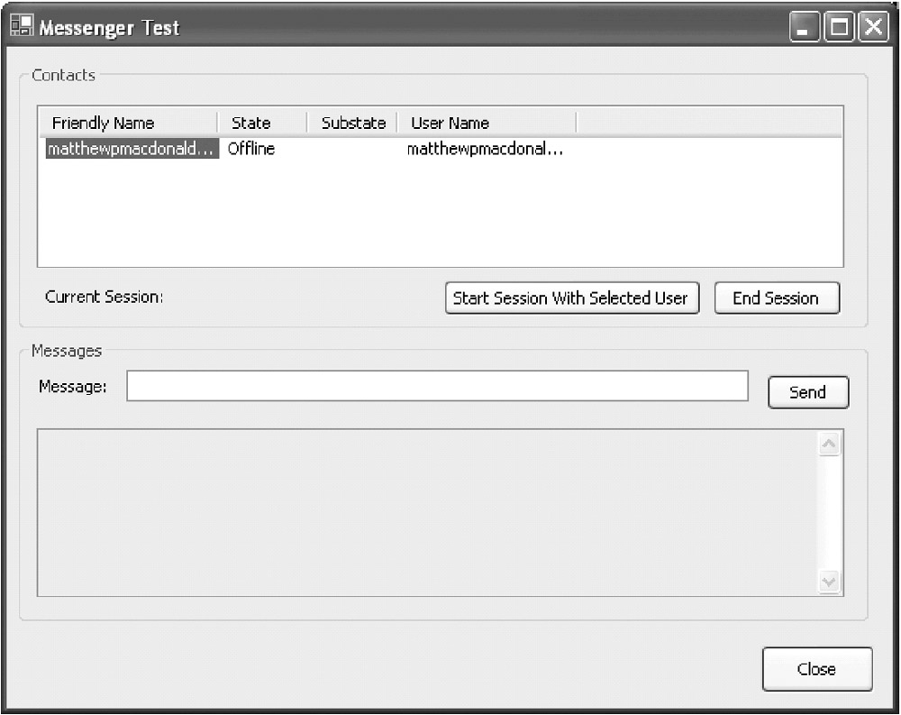 You start a session with one of your Messenger contacts. A session can be thought of as a separate chat window in the Messenger application. Before you can send messages to any user, either you (or the recipient) must start a session by opening a chat window. You can also create multiple sessions at once (although our simple example won't use this feature). Whenever a session is established, the contact list is updated.