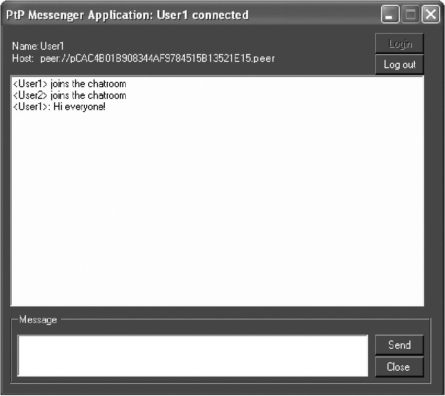This Messenger example is a Windows application that allows instant messaging, similar to the Talk .NET application. It uses a global session concept, whereby all registered peers become a part of the same chat room. Messages are sent to every peer, which means that the system won't scale well to extremely large networks.