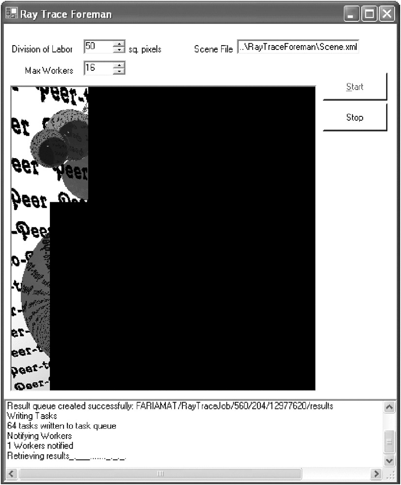 SharedCyclesP2P (see Figure 13-11) is a Windows application that demonstrates one way to build a distributed task manager. SharedCyclesP2P uses a foreman application, which divides a computer-intensive graphic into a user-defined number of smaller jobs and a large number of worker peers that perform the actual work. The foreman assigns job portions to the pool of workers and combines the results. One of the most interesting aspects of the SharedCyclesP2P application is that it tackles a relatively practical example (rendering a ray trace drawing), rather than the more rudimentary prime number search that's used to demonstrate distributed computing in Chapter 6. Figure 13-11 shows a partially complete rendering job displayed in the foreman.